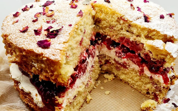 13. Using a sieve, dust the top with icing sugar and finish decorating with a sprinkle of edible rose petals and serve
